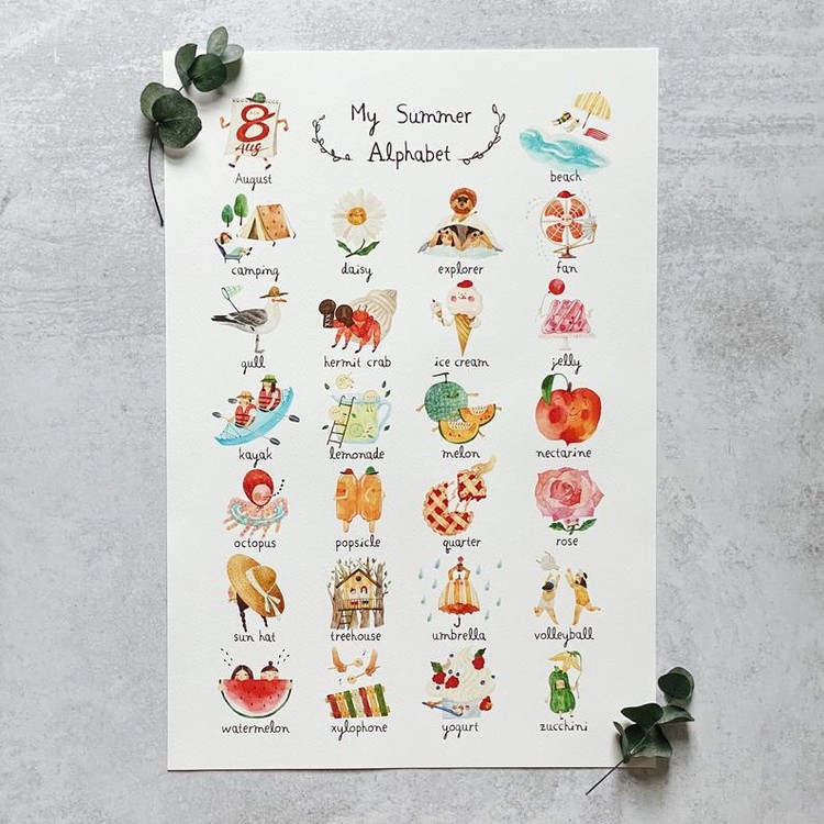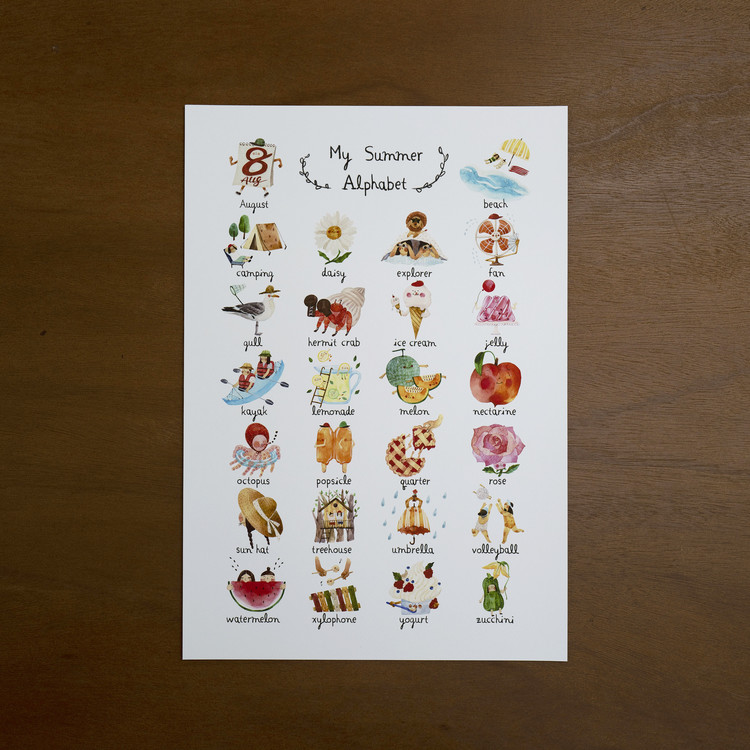 여름과 어울리는 기분 좋은 모티브들과 함께 알파벳을 만날 수 있어요. 아이스크림, 수박, 복숭아를 비롯해서 캠핑, 비치, 카약 등처럼 우리가 여름을 사랑하게 되는 모티브들이 가득합니다.